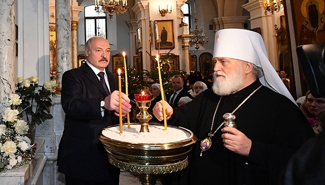 Александр Лукашенко зажег свечу и поставил ее возле Минской иконы Божьей матери. Его встретил митрополит Минский и Заславский Павел, патриарший Экзарх всея Беларуси.