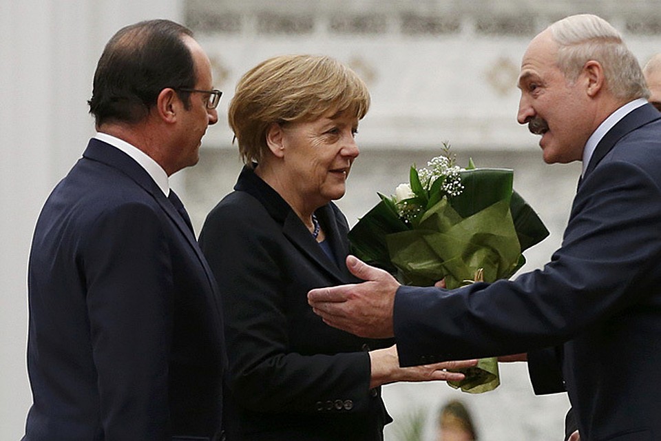 Лукашенко дарит цветы канцлеру Германии Ангеле Меркель