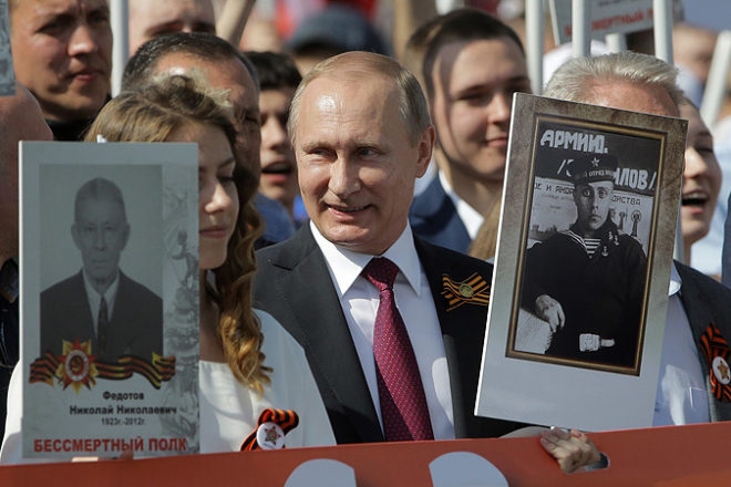 «Бессмертный полк» - международная общественная акция, которая проводится 9 мая в тех странах мира, где есть российские диаспоры. Во время акции участники идут колонной и несут портреты солдат, воевавших на стороне СССР во время Второй мировой войны. Акция официально поддерживается и проводится российскими властями, в 2015 году в шествии в Москве принимал участие президент России Владимир Путин.