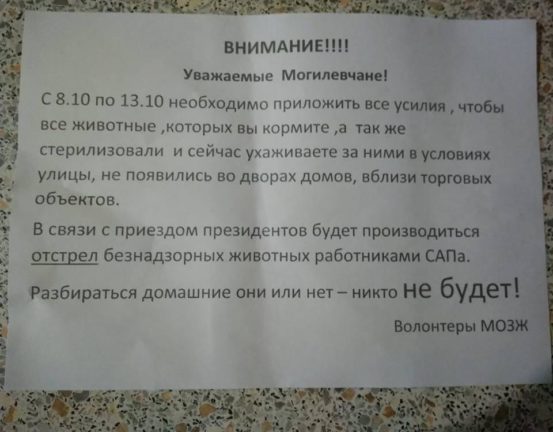 В сообщении утверждается, что из-за визита в Могилев Лукашенко и Путина собак и кошек будут отстреливать.
