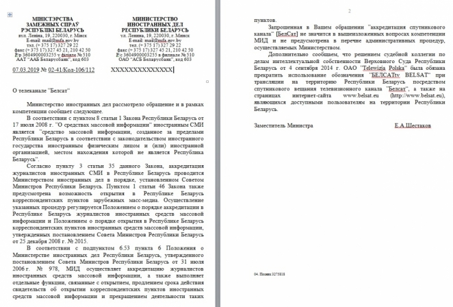 «Запрашиваемая в вашем обращении «аккредитация спутникового канала «Белсат» не значится в выше изложенных вопросах компетенции МИД и не предусмотрена в списке административных процедур, которые осуществляет Министерство», – говорится в письме заместителя министра.