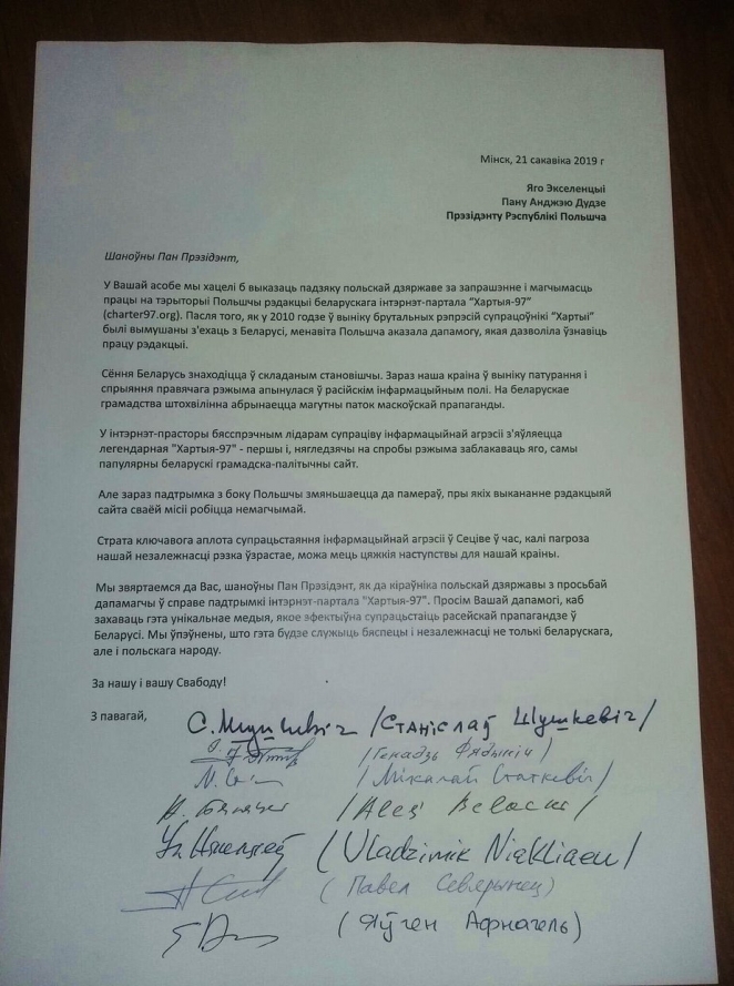 Мы обращаемся к вам как к руководству польского государства с просьбой помочь в деле поддержки интернет-портала «Хартия-97». Просим вашей помощи для сохранения этого уникального медиаресурса, эффективно противостоящего российской пропаганде в Беларуси. Мы уверены, что это полужит безопасности и независимости не только белорусского, но и польского народа.