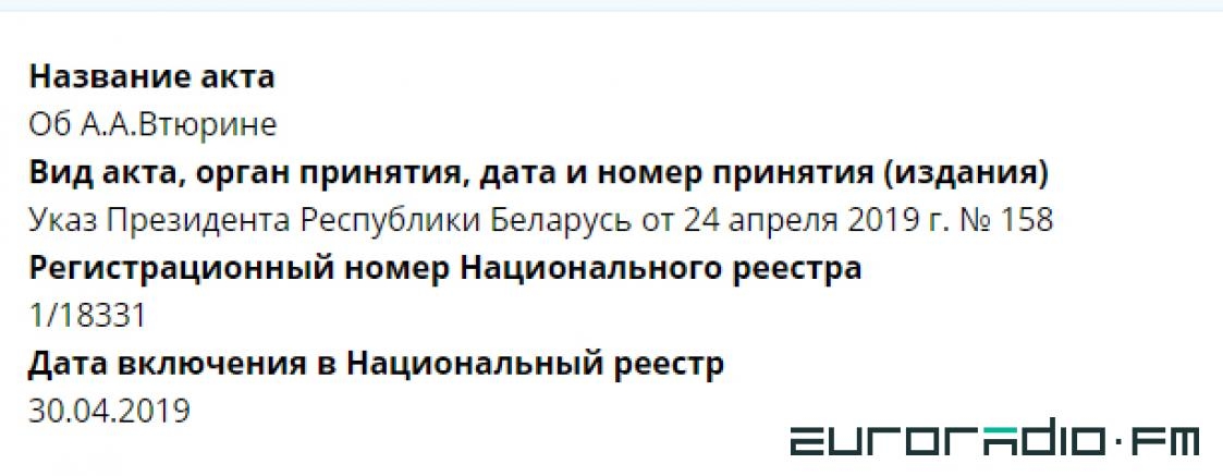 Указ “об А. А. Втюрине“ №158 Лукашенко подписал ещё 24 апреля