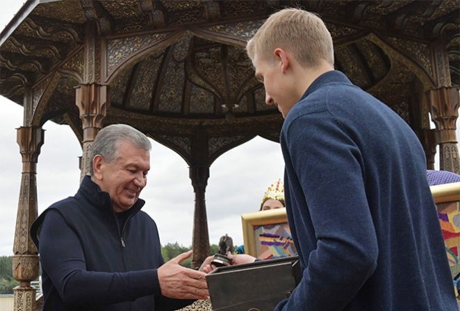 Как информирует пресс-служба президент Беларуси, главы государств прогулялись по территории резиденции, а затем обменялись подарками. Александр Лукашенко презентовал своему узбекскому коллеге панно "Беларус" и белорусскую вышиванку, а его младший сын Николай вручил президенту Узбекистана статуэтку зубра. Шавкат Мирзиёев в свою очередь подарил Главе государства статую хоккеиста.