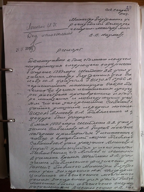 Во многом выводы правозащитников базируются на рапорте 2000 года генерал-майора Николая Лопатика главе МВД Владимиру Наумову, в котором тот называл исполнителем похищения полковника МВД Дмитрия Павличенко.