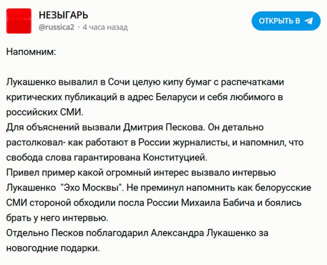 Заявление Лукашенко очень скоро нашли отклик у тех, о ком он говорит на встречах с Путиным. Одним из первых отозвался известный сомнительными сливами Telegram-канал «Незыгарь»: