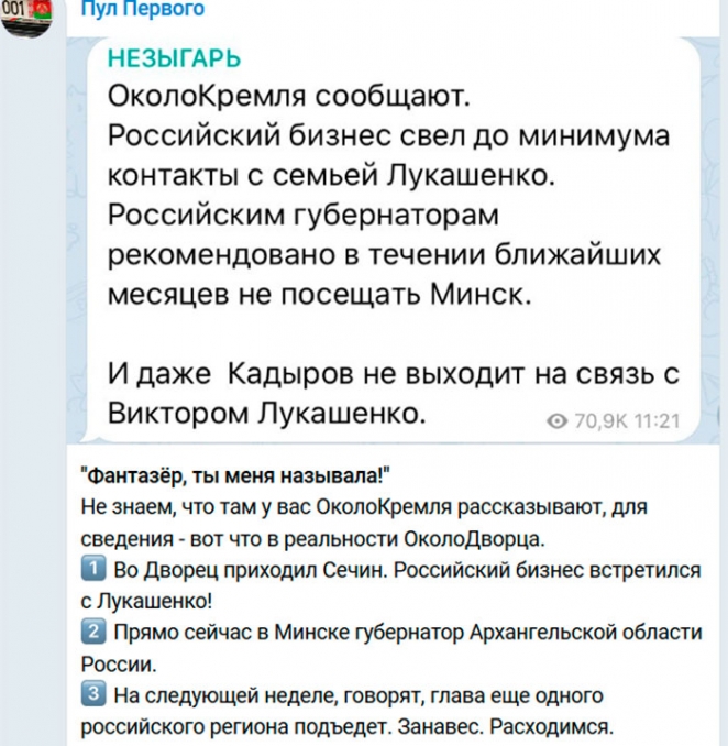 Telegram-канал Пул Первого использовал встречу с Сечиным, чтобы дезавуировать очередной вброс со стороны российского Telegram-канала Незыгарь: