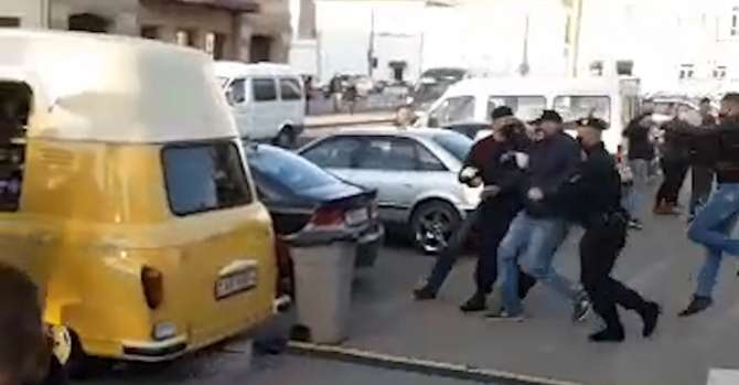 «Такая манера общения с людьми переросла в потасовку. Попытавшаяся навести порядок милиция оказалась в эпицентре драки, которую устроили на площади. Один из сотрудников милиции подвергся нападению», — сказал ведущий.