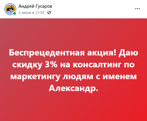 Директор маркетингового агентства Gusarov Андрей Гусаров готов со скидкой проконсультировать людей с именем Александр: