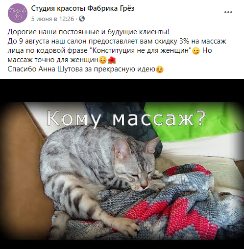 Руководителей студии красоты "Фабрика Грёз", видимо, очень зацепило высказывание президента о женщинах и конституции, поэтому до 9 августа по кодовой фразе "Конституция не для женщин" можно получить скидку 3% на массаж лица: