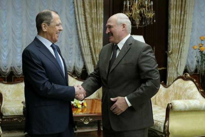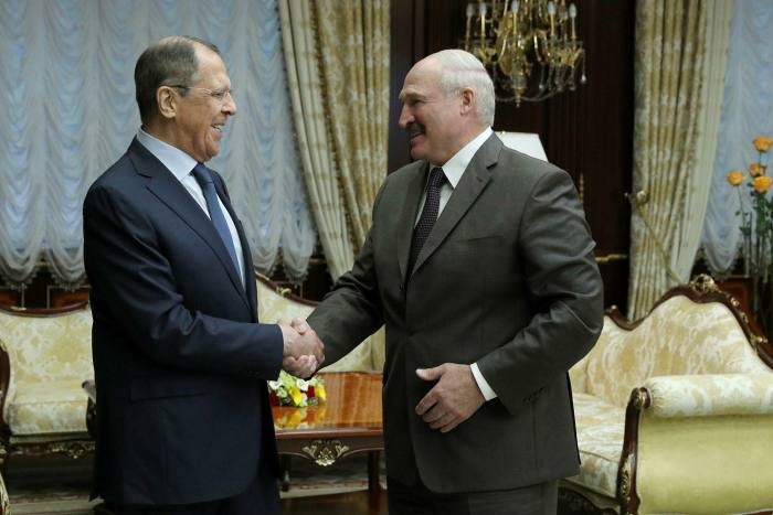 Александр Лукашенко (справа) с министром иностранных дел России Сергеем Лавровым в Минске 19 июня. Президент был под нарастающим давлением со стороны Москвы © Максим Гучек/Бейта/раздаточные материалы через агентство Рейтер