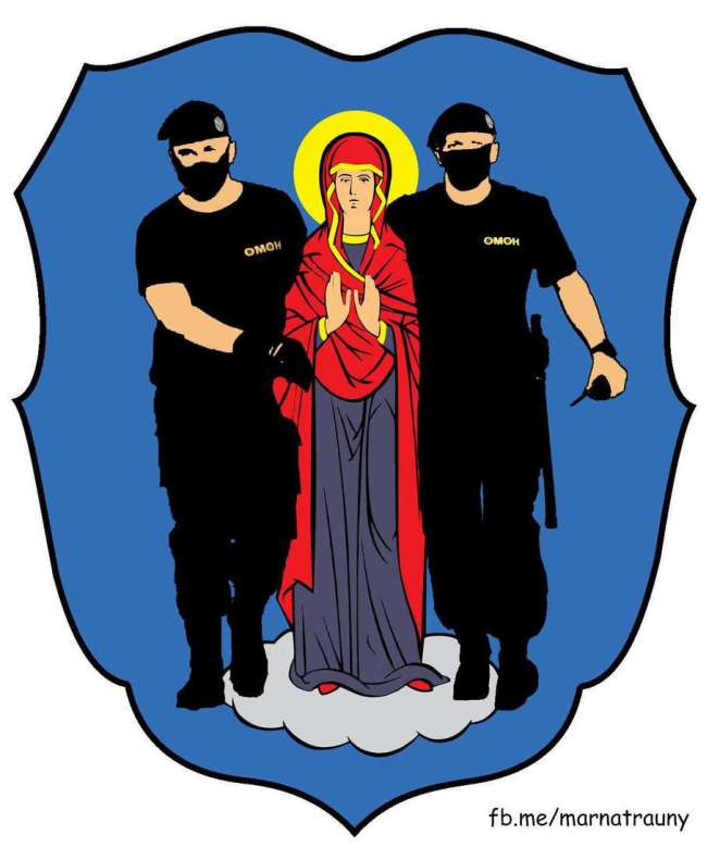 Что же люди об этом говорят и пишут? Дословно привести, к сожалению, не можем - ненормативной лексики много. Сплошные оскорбления чувств верующих в белорусскую законность и правопорядок. Из цензурного - по сетям блуждает фотография бабушки в платочке с котенком на руках да текстом: «Узнала, что внук омоновец - переписала хату на кота». Ну и картинка со стилизованным гербом Минска, где Матерь Божью ведут под руки два амбала в черных беретах и масках… Такая она, народная любовь.