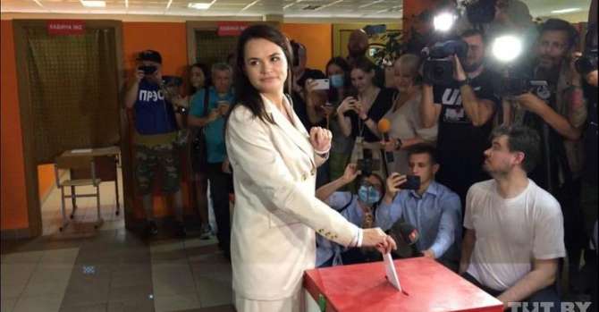 После голосования Тихановская попыталась выйти на ступеньки школы, но толпа журналистов устроила коллапс на выходе. На улице кандидата люди встретили аплодисментами и криками «Света». Некоторые просили ее расписаться в паспорте, некоторые — оставить автограф на открытке. Поддержать соратницу приехала и Мария Колесникова.