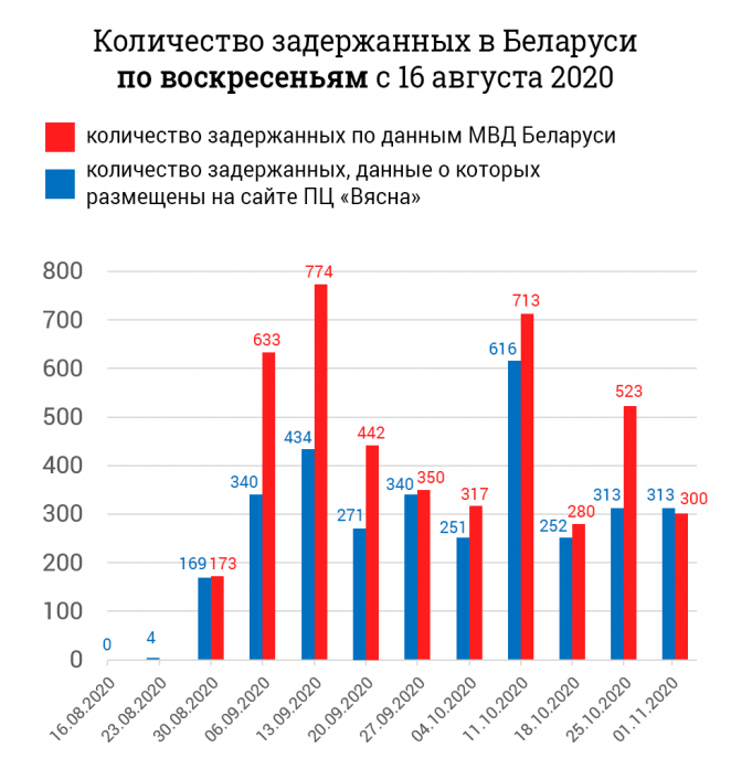 Пресс-релизы на сайте ПЦ «Весна» позволяют понять примерную динамику задержаний по дням недели. Для наглядности из следующего графика мы исключили первую неделю после выборов, и начали отсчет с первого воскресного марша 16 августа.