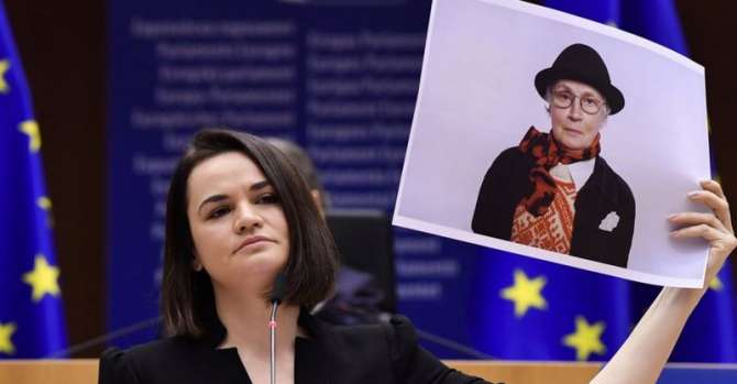 Светлана Тихановская во время выступления в Европарламенте показывала портреты протестующих, фото ЕРА