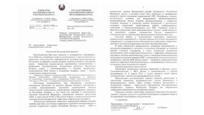 В нем Анатолий Лаппо приглашает россиян «создать совместные разведывательные посты радиоэлектронной разведки органов погранслужбы [Беларуси] и специальной технической разведки пограничных органов ФСБ России на территории Беларуси с задействованием специальных технических средств российской стороны».