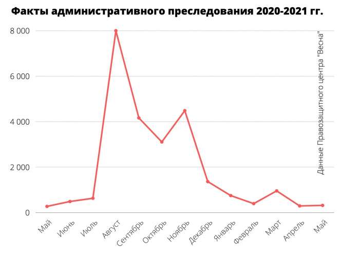 В мае 2020 года более 80% зафиксированных «Весною» административных дел проходили по бывшей статье 23.34 «нарушение порядка организации и проведения массовых мероприятий». В мае 2021 года по той же статье (только с измененным в КоАП номере с 23.34 на 24.23) было зафиксировано более 76% административных дел.