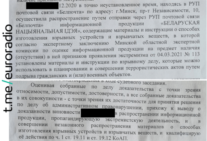 Книга, напомним, содержит 85 интервью выдающихся белорусов на темы национальной идентичности и поиска национальной идеи. Она составлена по мотивам разговоров в программе "Ідея Х", которая выходит на Еврорадио. Естественно, никаких инструкций по взрывному делу, "которые можно использовать в планировании и совершении террористических актов путем подрыва гражданских и (или) военных объектов", там нет.