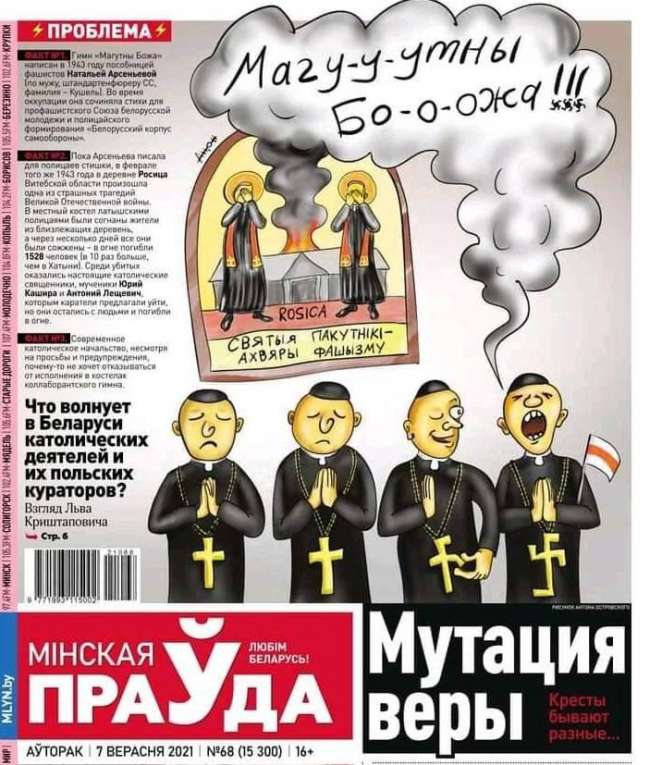 Государственная газета "Минская правда" накануне опубликовала на первой полосе карикатуру на католических священников, которые делают из креста свастику и поют "Магутны Божа".