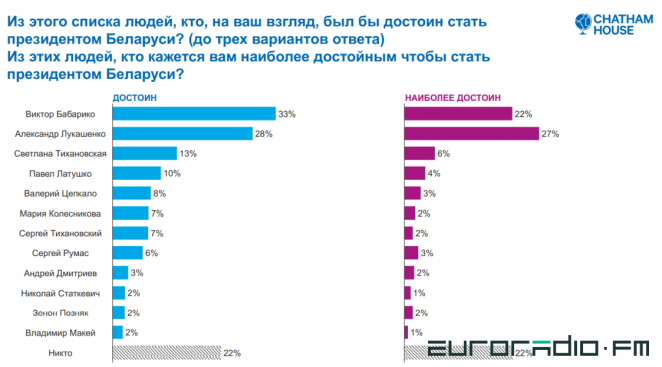 По данным исследования, самым популярным кандидатом в президенты оказался Виктор Бабарико. Треть респондентов отметили его как достойного кандидата в президенты, еще 22% как наиболее достойного. Чуть больше 20% заявили, что никогда не проголосовали бы за него.