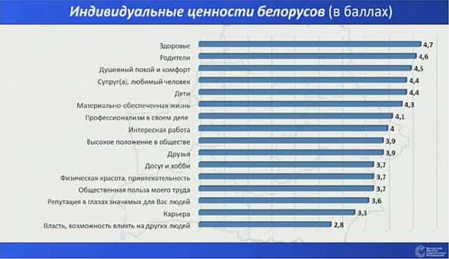 Социологи государственного Белорусского института стратегических исследований (БИСИ) представили новое исследование, посвященное личным и коллективным ценностям белорусов — «Ценностный портрет современного белорусского общества».