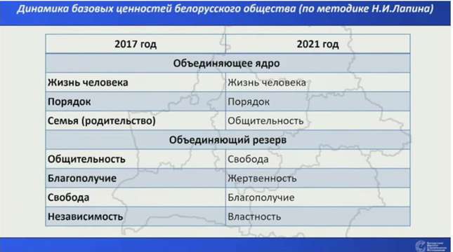 Комментируя по просьбе Naviny.by результаты исследования, Геннадий Коршунов обратил внимание, что до 2020 года в тройке главных коллективных ценностей были здоровье, семья и дети. Теперь (по данным этого исследования) мир, безопасность и свобода, которые набирают от 95% до 97%, то есть могут считаться максимально общезначимыми.