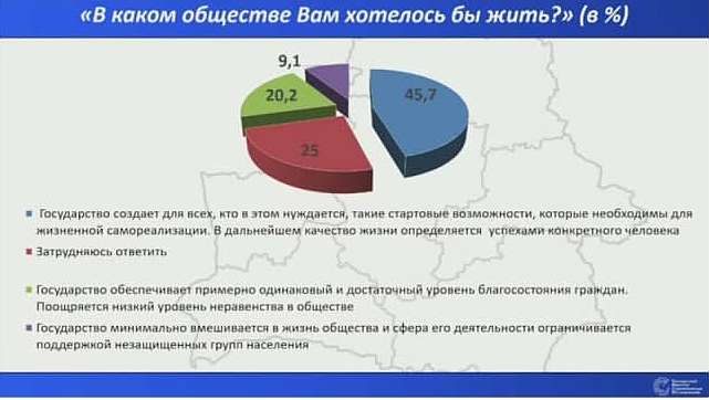 В ответе на вопрос об идеальном обществе у подавляющего большинства граждан есть запрос на социально ориентированное государство, полагает Алейникова. На это, считает аналитик БИСИ, указывают ответы на вопрос, в каком идеальном обществе людям хотелось бы жить. «Мы уже живем в обществе одинаковых стартовых возможностей, которые государство предоставляет для самореализации, считают респонденты», — сказала Алейникова и констатировала устойчивость патерналистских и потребительских установок в отношении государства.
