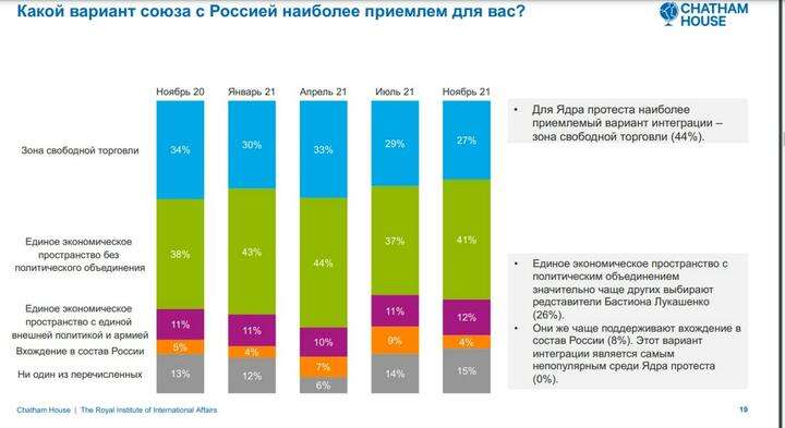 Доли респондентов, которые выступали за присоединение Беларуси к России и за отказ от тесных связей с РФ в вопросе-меню в летнем и осеннем опросах 2021 года, действительно намного меньше, чем в ответах на соответствующие бинарные вопросы и в тех же опросах, и в мартовском 2022 года.