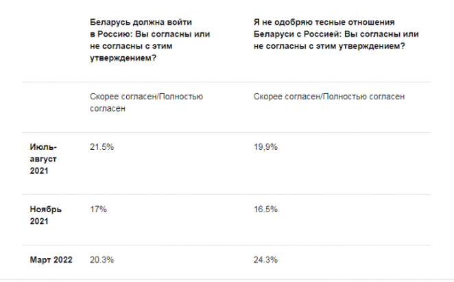 При этом я сравнил ответы на бинарные вопросы мартовского опроса 2022 года («Беларусь должна войти в Россию: Вы согласны или не согласны с этим утверждением?» и «Я не одобряю тесные отношения Беларуси с Россией: Вы согласны или не согласны с этим утверждением?») с ответами в предыдущих опросах на вопрос-меню, в котором предлагался набор из 5 вариантов различных форм двусторонних отношений — от отказа от какой-либо интеграции с РФ до присоединения Беларуси к России.