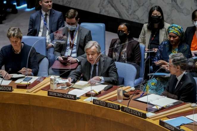 Генеральный секретарь ООН Антониу Гутерриш и госсекретарь США Энтони Блинкен на заседании Совета Безопасности ООН 19 мая. Фото JOHN MINCHILLO/ASSOCIATED PRESS