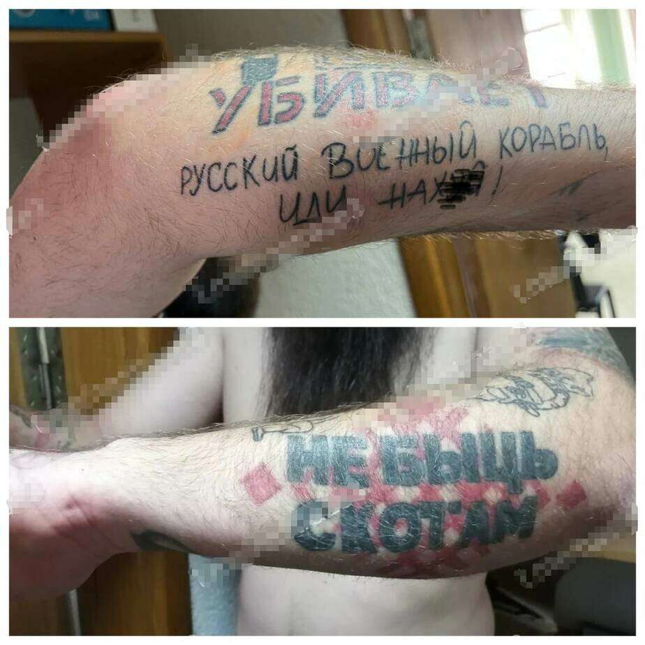 Повод — «протестные» татуировки. Среди них — «БТ убивает», «Русский военный корабль, иди н***», «Не быць скотам» и другие.