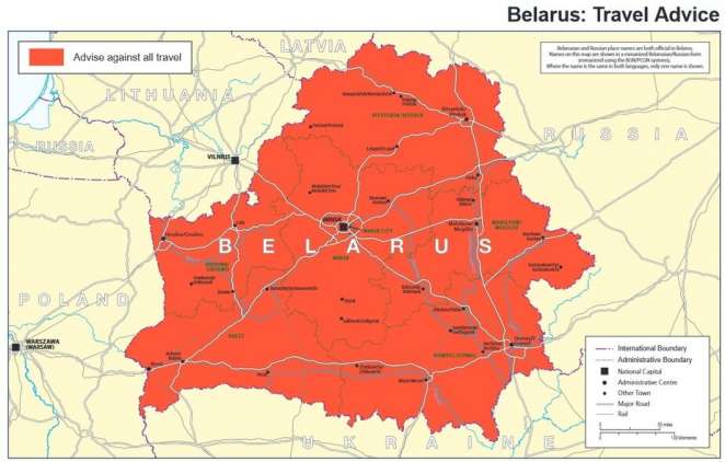 Карта от МИД Великобритании. Беларусь на ней — зона, в которую нежелателен въезд