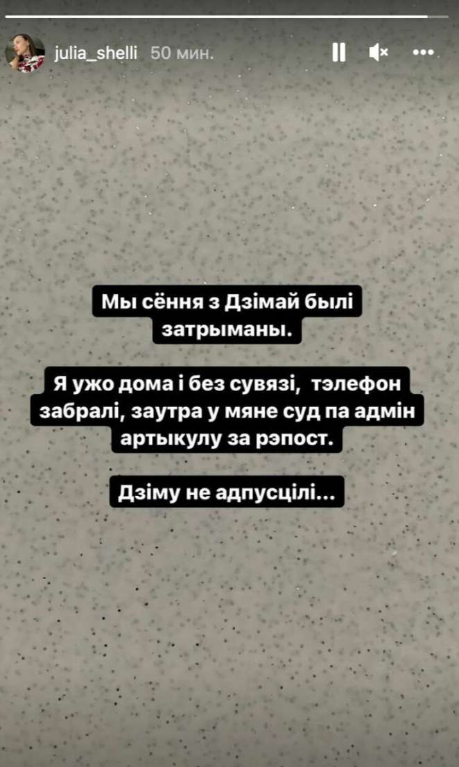 «Нас сегодня с Димой задержали. Я уже дома и без связи, телефон забрали, завтра у меня суд по административной статье за репост. Диму не отпустили», — рассказала Юлия Семченко в соцсетях.