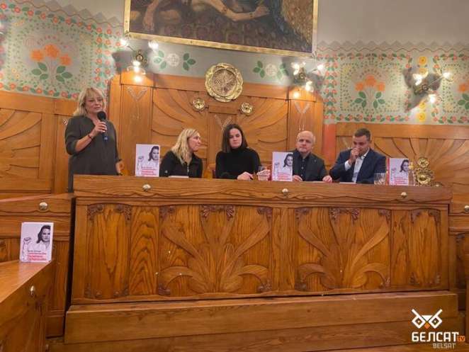 Участники презентации книги: Светлана Тихановская, Руслан Шошин, польский политик и профессор Павел Коваль. Фото: belsat.eu