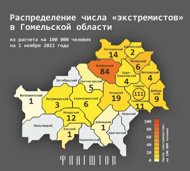 В относительном выражении доля «экстремистов» в Гомельской области составляет 2,2 человека на 10 тысяч жителей. Это самый высокий показатель среди всех областей Беларуси и Минска. Конкуренцию Жлобинскому району составляет лишь Чечерский, где на 10 тысяч жителей приходится более 4 «экстремистов».