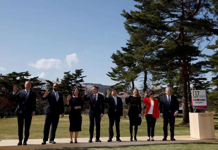 Слева направо: заместитель генсека Европейской службы внешних связей Энрике Мора, глава МИД Великобритании Джеймс Клеверли, глава МИД Германии Анналена Бербок и госсекретарь США Энтони Блинкен, глава МИД Японии Ёсимаса Хаяси, глава МИД Канады Мелани Жоли, глава МИД Франции Катрин Колонна, глава МИД Италии Антонио Таяни 17 апреля 2023 года на встрече глав МИД G7 в Каруидзаве, Япония. Фото: Reuters