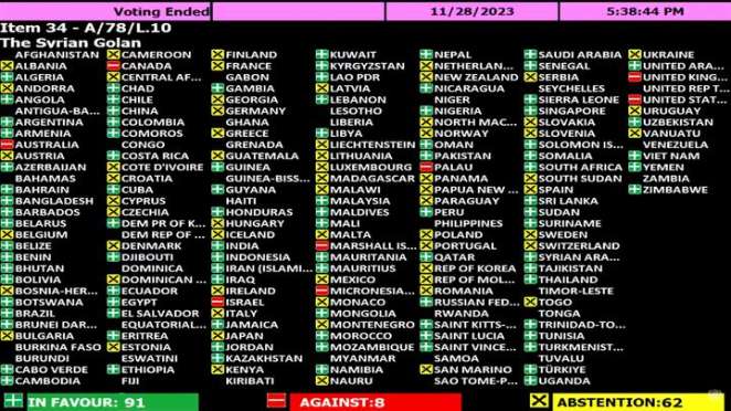 За принятие резолюции проголосовала 91 одна страна, включая Беларусь. Против — восемь стран, в том числе Израиль, США, Великобритания, Канада и Австралия. Воздержались 62 государства.