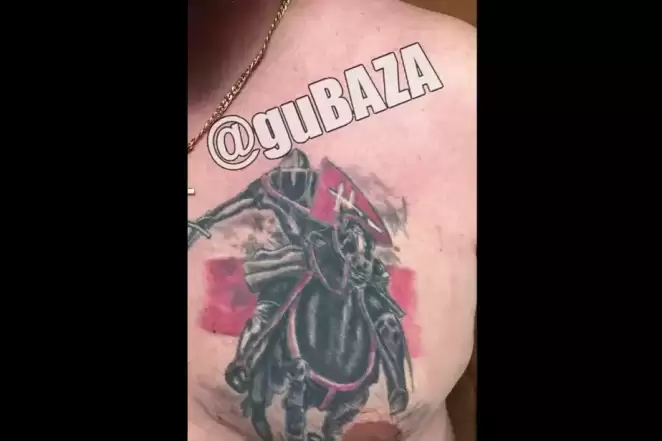 Отец, работающий дальнобойщиком, показывает на видео татуировку с «Погоней». По его словам, он сделал ее восемь лет назад и обещает, что «будет убирать ее».