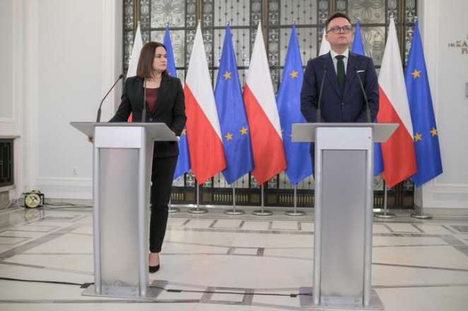 Спикер польского Сейма Шимон Головня и лидерка беларусских демократических сил Светлана Тихановская на пресс-конференции в Варшаве, 9 января 2024 года. Фото: «Зеркало»