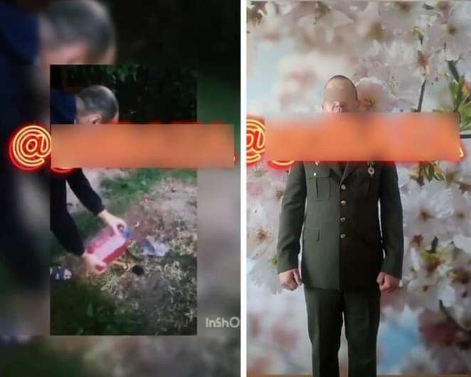 Один из задержанных ранее служил во внутренних войсках. В видео показали архивный фрагмент, где он бросает на землю головной убор и шевроны, обливает их жидкостью и поджигает.