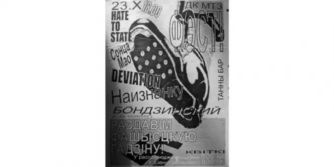 Афиша фестиваля «Раздавім фашысцкую гадзіну», конец 90-х. Вместе с Hate to State выступает гродненская группа Deviation, в которой вокалистом был Стас Почобут, брат политзаключенного Анджея Почобута