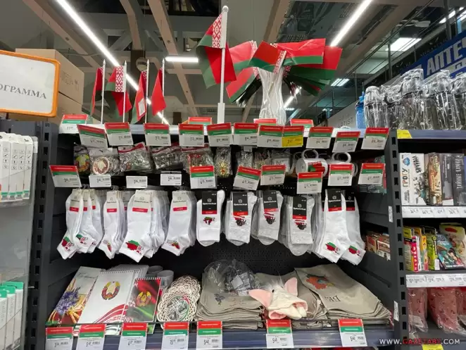 Во всех торговых центрах, продовольственных и промтоварных магазинах помимо вывешенного на входе официального флага появились отделы, где продаются товары с государственной символикой. Перед «выборами» ассортимент в этих точках значительно увеличился.