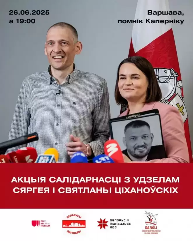 Акция солидарности с участием недавно освобожденного политзаключенного Сергея Тихановского и его жены, демократической лидерки Светланы Тихановской, назначена на четверг, 26 июня, сообщает пресс-служба Светланы Тихановской.