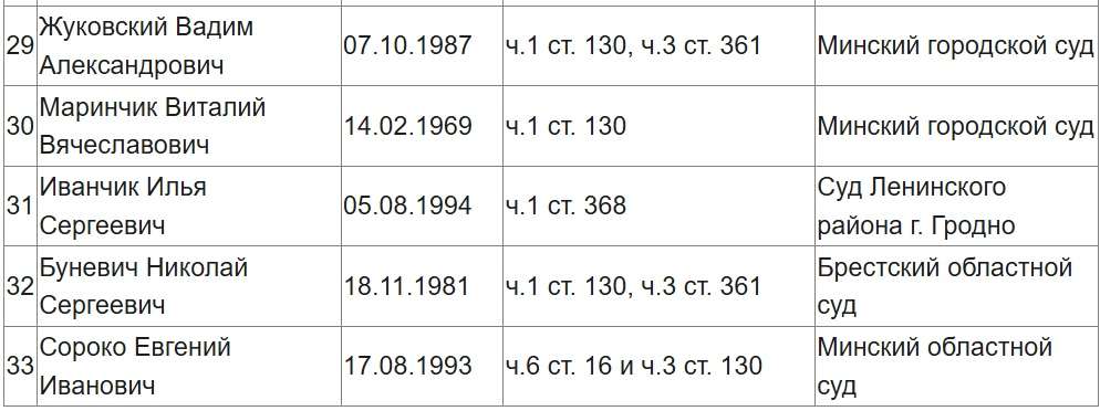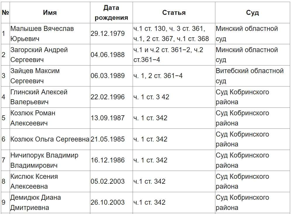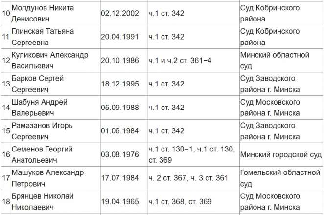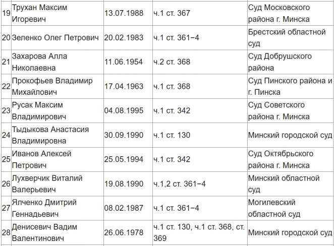 Из попавших в список всего шесть женщин, все остальные — мужчины. Самой старшей 71 год. Это Алла Захарова, по всей видимости, из Добрушского района. Ее судили за оскорбление Лукашенко.