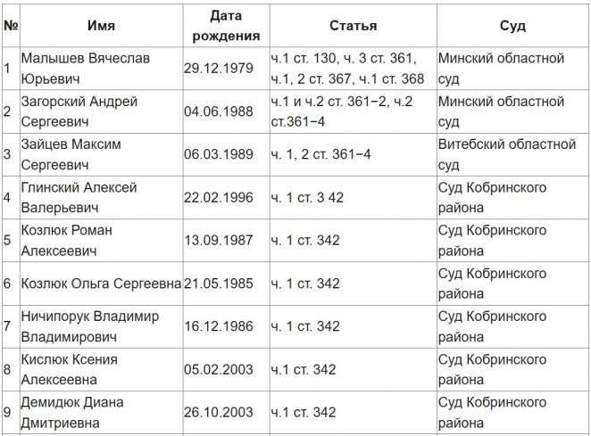 Самой младшей 21 год. Это Диана Демидюк из Кобринского района. Ее судили по «народной» статье за участие в действиях, грубо нарушающих общественный порядок.