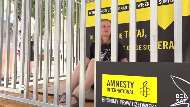 В центре Варшавы 9 августа появилась клетка, символизирующая беларусскую тюрьму. В клетке и вокруг нее – люди, которые рассказывают о репрессиях в Беларуси. Акцию провели правозащитники Amnesty International вместе с беларусскими правозащитниками и бывшими политзаключенными.