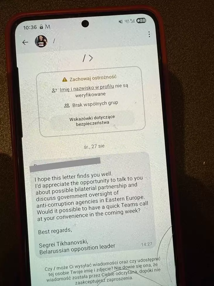 В этих сообщениях, рассылаемых европейцам, фейковый Тихановский пытается завязать контакты.