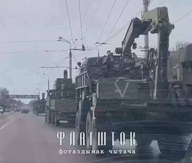 Колонна российских военных грузовиков в Гомеле, апрель 2022 года. Фото: читатель «Флагштока»