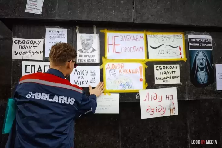 Рабочий читает протестные плакаты, приклеенные к памятнику Ленину на площади Независимости. 14 августа 2020-го. Фото LookByMedia