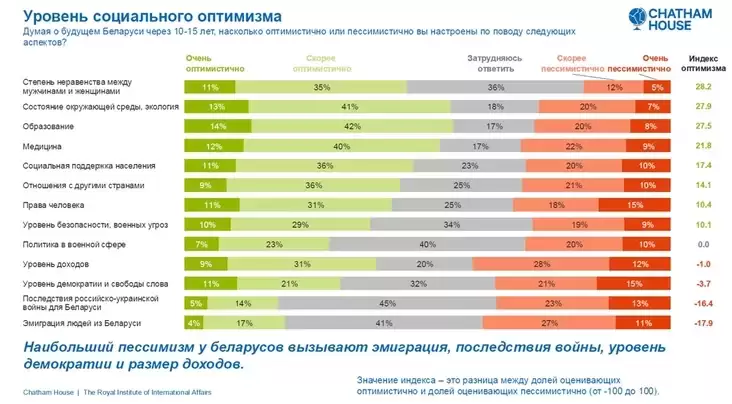 Белорусы склонны пессимистично оценивать последствия российско-украинской войны, а также эмиграцию населения. Немного оптимизма вызывает и ситуация со свободой слова и уровнем доходов.